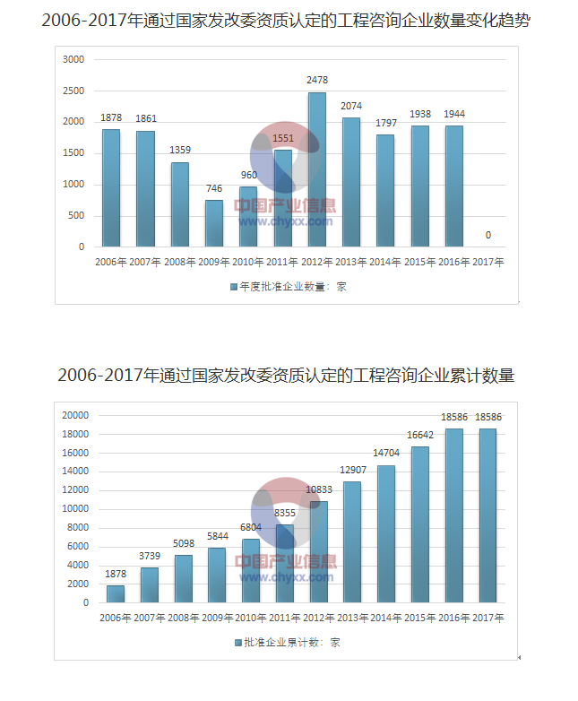 2006年開始,國家發(fā)改委開展工程咨詢單位資格認(rèn)定工作。2005年之前發(fā)改委原頒發(fā)的臨時(shí)級(jí)、預(yù)備級(jí)、丙級(jí)工程咨詢資格證書有效期截止至2005年12月31日,需要重新申請(qǐng)工程咨詢資格。持有正式甲、乙級(jí)工程咨詢資格證書的單位,2006年另行申請(qǐng)工程咨詢資格。因此此處統(tǒng)計(jì)口徑主要是2006年以來通過國家發(fā)改委資格認(rèn)證的工程咨詢企業(yè)。