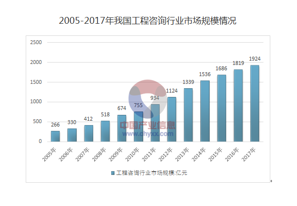 根據(jù)以往經(jīng)驗(yàn)假定,國家每投入1萬億元固定資產(chǎn)投資就需要投資30億元的工程咨詢支出, 2017年我國工程咨詢行業(yè)的市場(chǎng)需求規(guī)模達(dá)到1924億元。